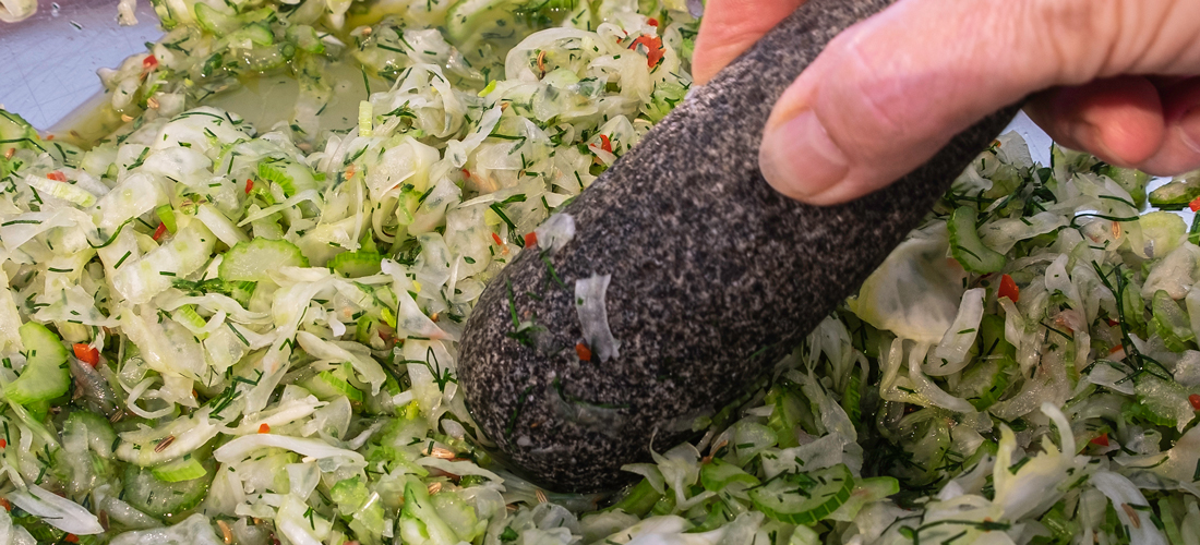 Make the most of an abundant celery and fennel harvest and create a unique winter preserve. Fennel’s lemony aniseed flavour teams perfectly with the earthy green notes of celery and thyme. The touch of heat from red chili offsets the cool and crispy kraut texture. Paying homage to the basic sauerkraut method of lactic acid fermentation, this combination is part of the new generation of krauts. Creative veggie combo’s, herbs and spices creates new taste sensations while maintaining the acknowledged benefits of naturally fermented sauerkraut. It's the perfect winter salad accompaniment and also works well with fresh or smoked seafood, eggs, creamy or tasty cheese. Throughout Europe and Asia, there's always some kind of pickled vegetable to be found in the kitchen. Thanks to Asa Simonsson’s book, Fermentation, for the inspiration to experiment with a Fennel Kraut.