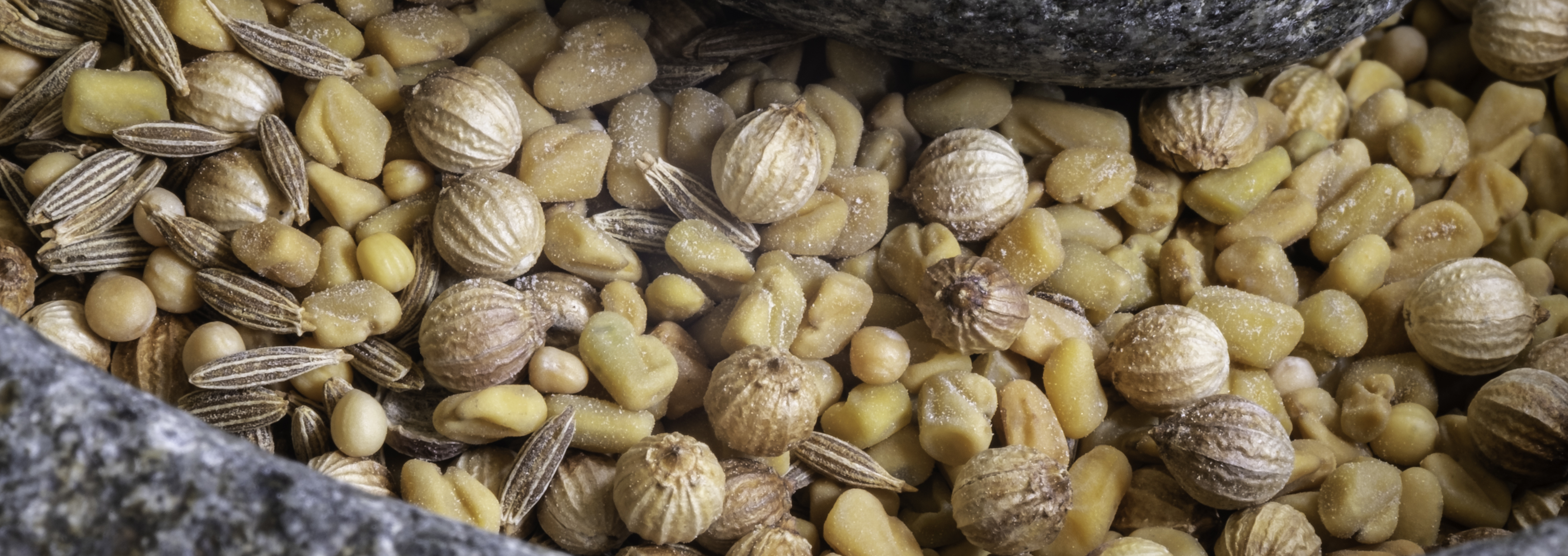 Once the first fermentation stage is complete, mix the mustard, fenugreek, coriander, and cumin seeds together. Using a mortar and pestle or a spice grinder, crush to a fine powder. Transfer to a small mixing bowl. Add the chili powder and asafoetida. Gently warm the oil, pour over the spices and mix thoroughly to a thick paste.