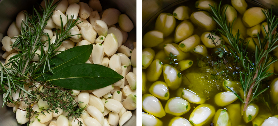 This preserving technique is comprised of a two-part process. The garlic cloves are gently poached in olive oil flavoured with aromatics, placed in jars, then completely covered with the poaching oil to preserve them.