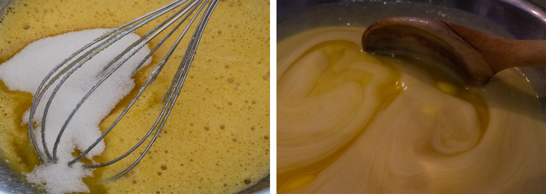 Strain and place into the bowl or the double boiler insert. Place over a saucepan of gently simmering water and add the sugar, butter and zest.