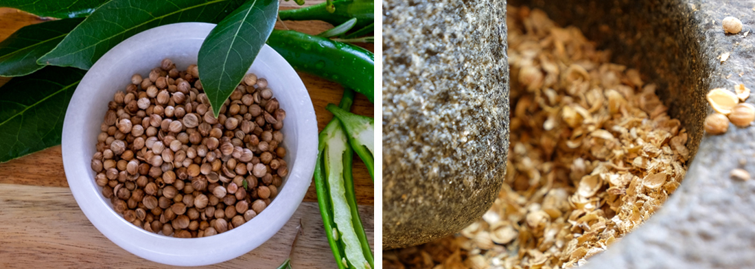 - A versatile spice, that has a bittersweet citrusy flavour with warm, floral undertones. Grown as an annual, stalks are cut before the fruits are fully ripe. They are threshed, cleaned, and dried. The stalks and roots are also edible and used frequently in Thai cooking.