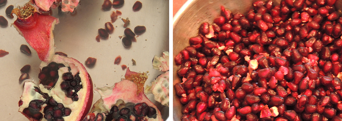 1. Cut the pomegranates in half and pull the inner membranes that contain the seeds apart and drop into a container of clean fresh cold water. Gently wash the seeds, being careful not to crush them as this will release the juice into the water. Separate the seeds from the membrane and discard it and the skin.