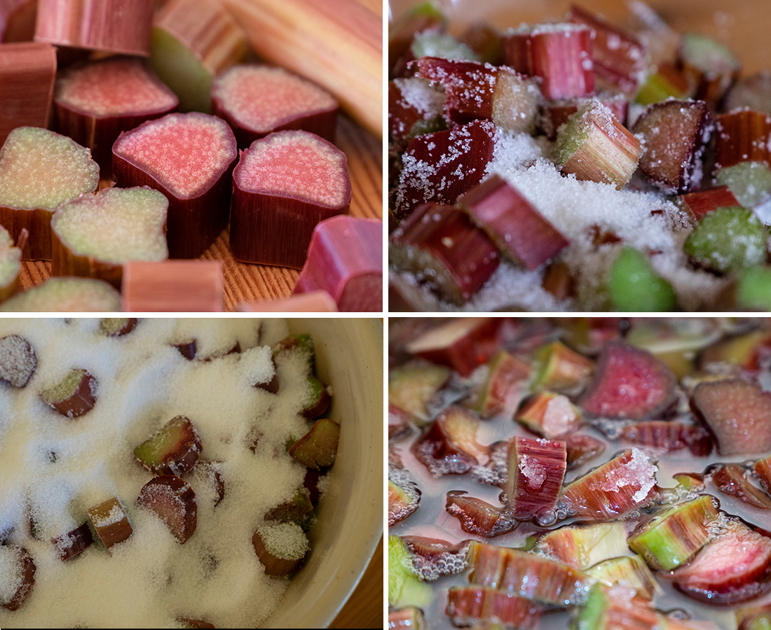 Macerating the rhubarb and sugar together overnight draws out the unique flavour and colour. This process is outlined in steps 1 - 2 below.