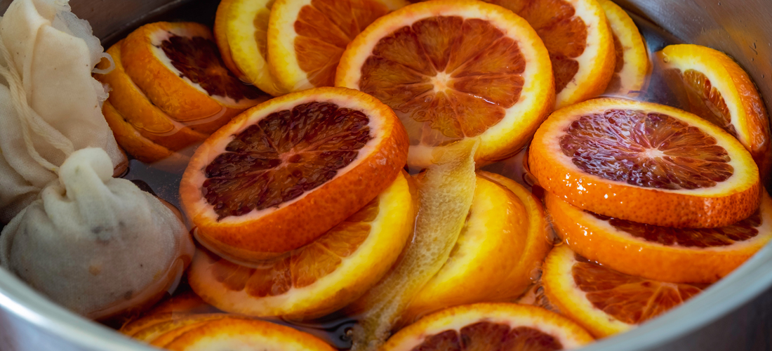 3. Place the vinegar, sugar, and spice bag in a saucepan. Heat gently, stirring occasionally, to dissolve the sugar. Then bring to the boil and add the sliced orange to the pan and simmer gently until the peel is tender, approximately 20 minutes.