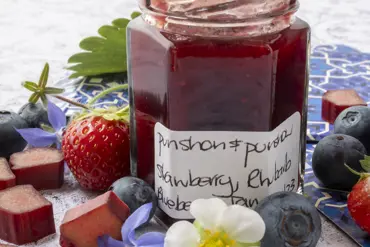 Sweet soft berries combined with the tang  of rhubarb; this  jam is one of the specialty pots in our pantry....