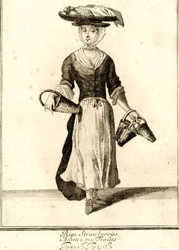 On the other side of the channel, English ladies indulged their love of strawberries and cream by having plants cultivated in their gardens. The strawberry affair became contagious. By the 1600s, they were sold by wandering street vendors in London and Paris. Picked at their peak, these fragile fruits demanded protection and were packaged in unique cone shaped straw baskets called ‘pottles.’ Harvested, packed, and rushed to the market, they were expensive and soon gained a reputation as an upper-class snobbish food.